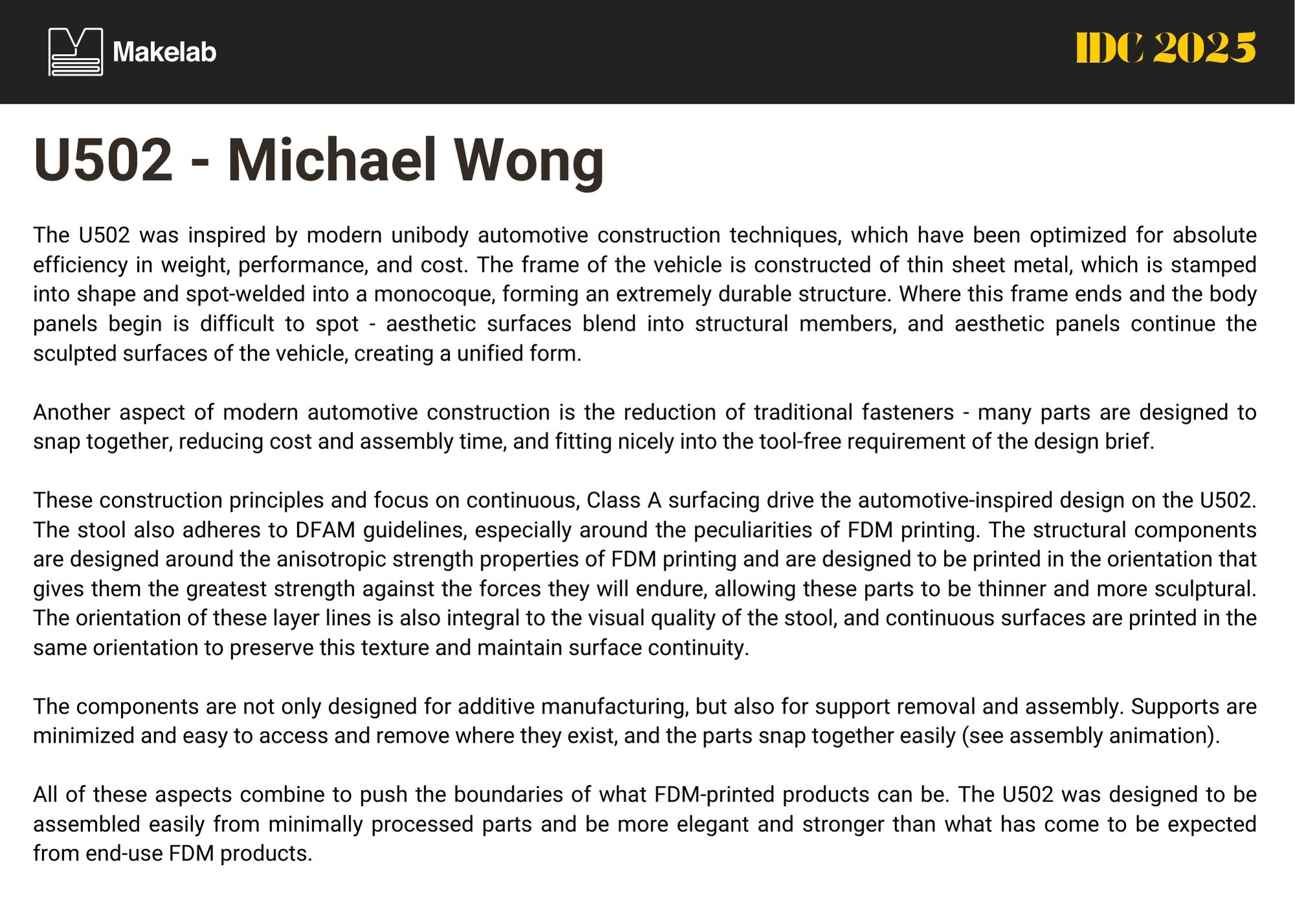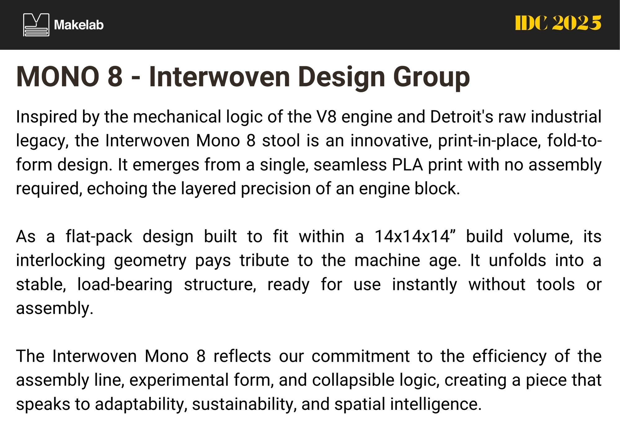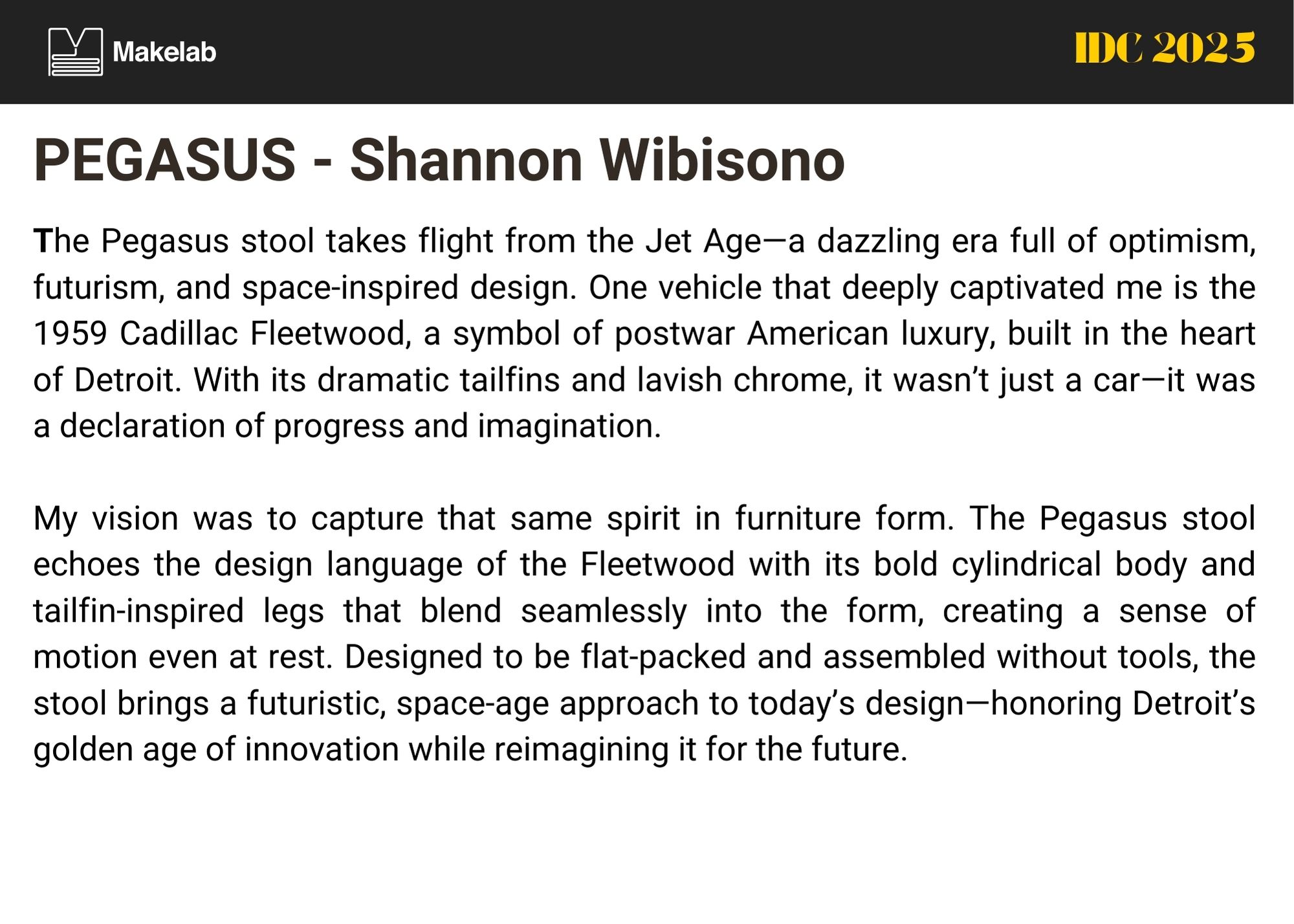 Design a 3D-printed stool that reflects the mindset of Detroit’s automotive legacy. Your design should be optimized for additive manufacturing, made in PLA, ship flat, and assemble without any tools or hardware.